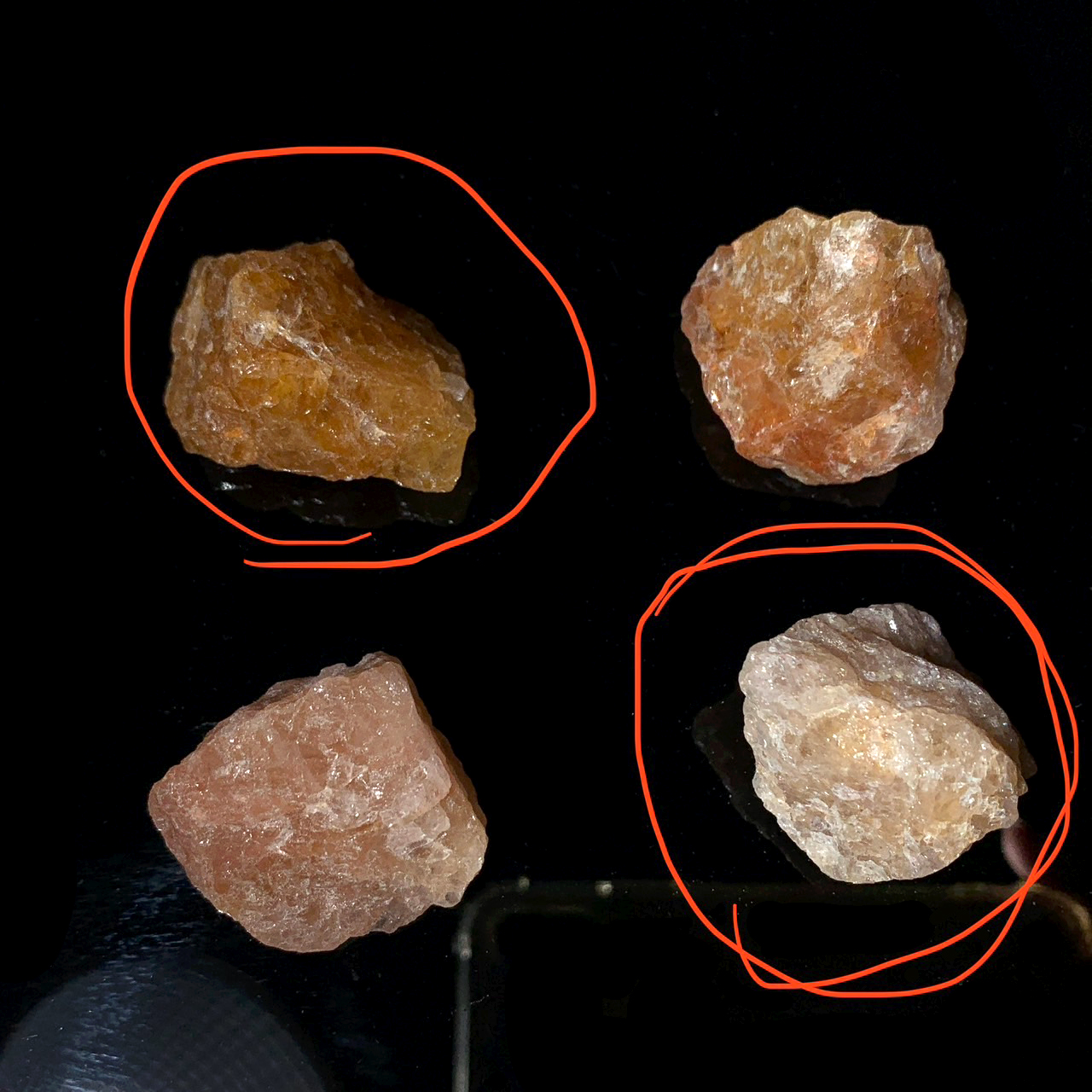 在收到喜馬拉雅黃金與紅金許多次後,在一定數量的經驗累積下,我發現以喜馬拉雅”黃金”出貨到我手中的礦石,多數也都有一點點紅色或紅褐色,原以為官方在分類時,是以顏色分布的多寡來區分,畢竟一點點橙紅色調就歸在紅金好像也不夠彰顯紅金的特質,但上個月我收到的一批紅金,完全沒有任何紅色或橙紅色 (下圖圈起來的那兩顆),於是我跟美國官方進行了一些討論,目前確定的是,他們的分類方式是以岩塊為主,因為喜馬拉雅黃金與紅金是從較大的岩塊上橇下來的,只要岩塊主體有橙紅色調的特徵,從這個岩塊上橇下來的所有礦石都會被分類在紅金裡,所以即使這個岩塊上有些區域沒有任何紅色調,橇下來的仍會被歸類在紅金之中。