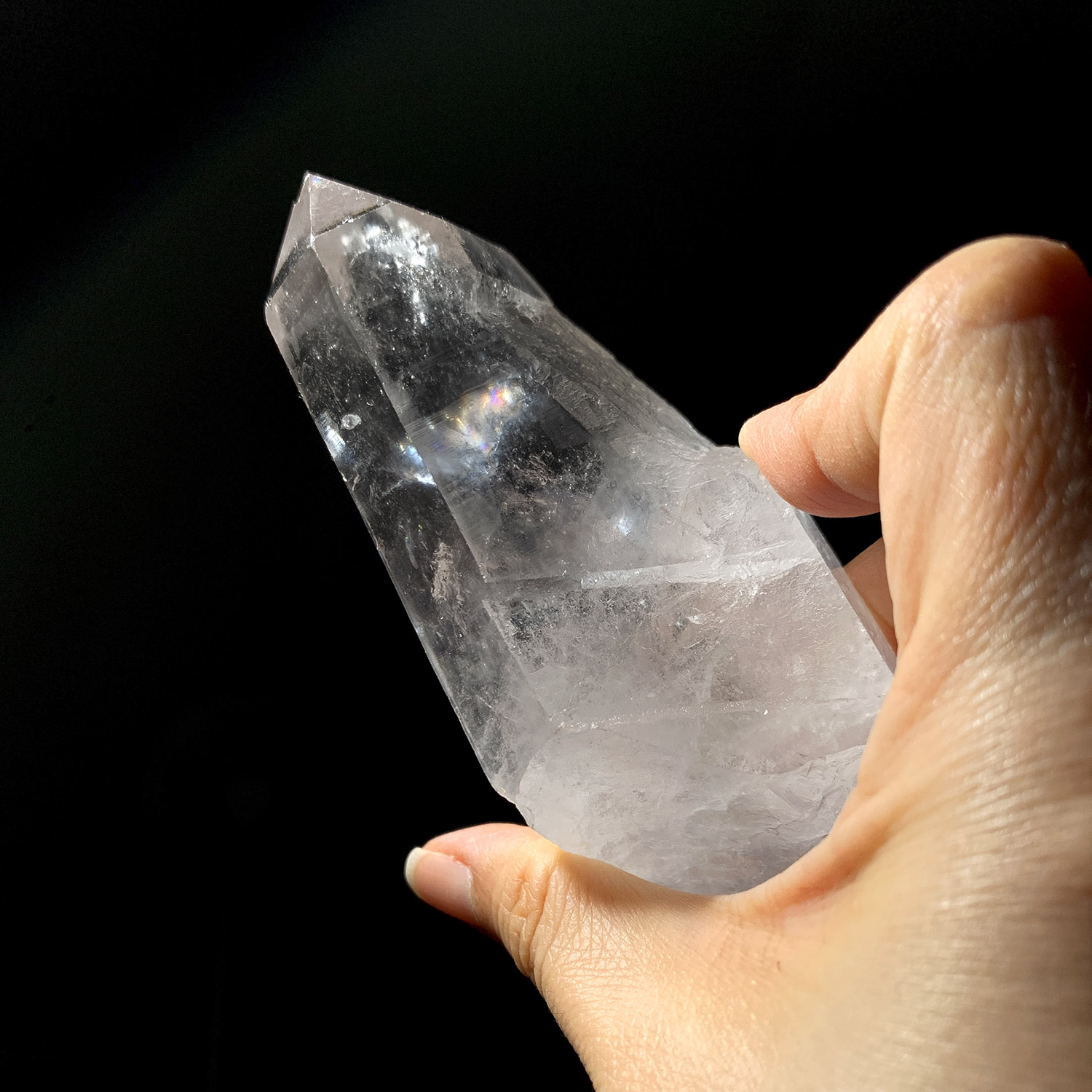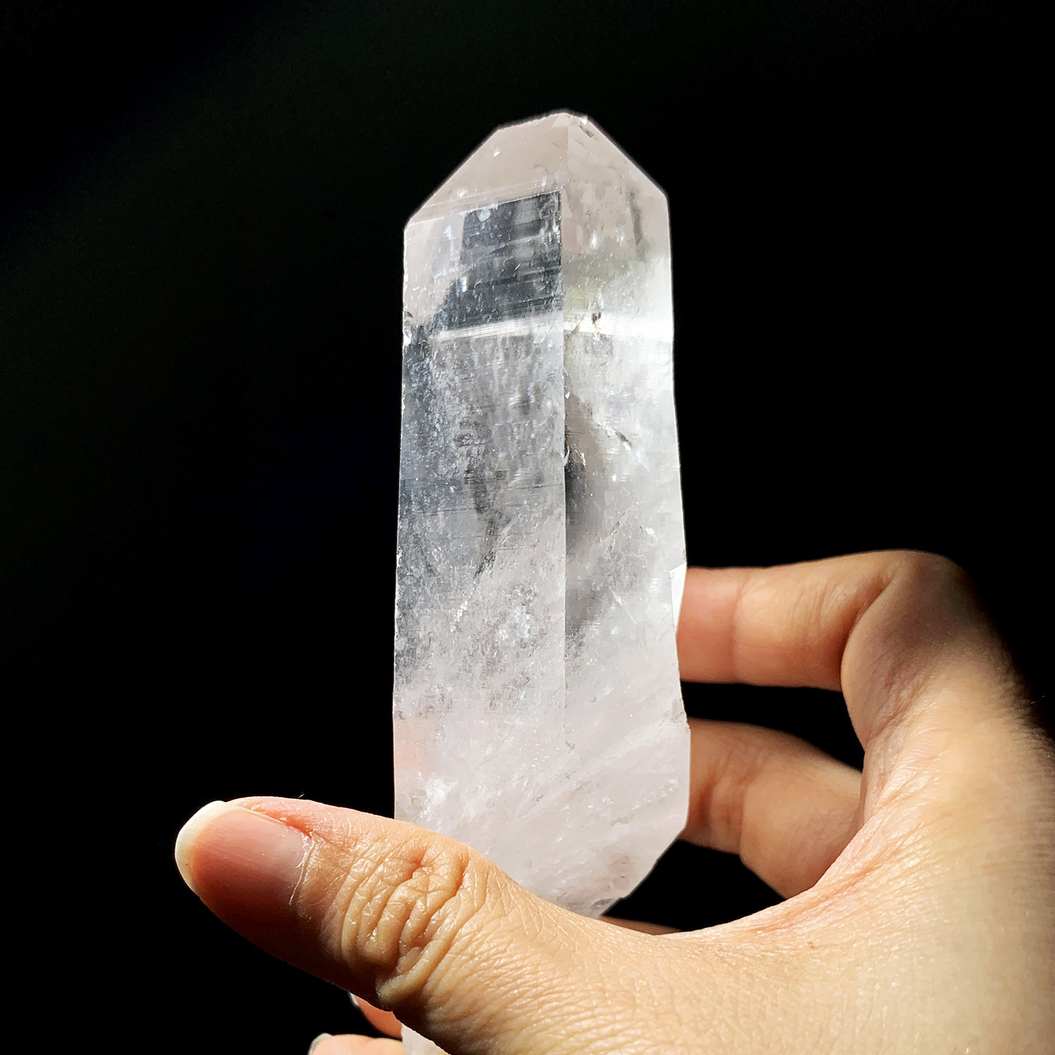 晶體的側面有水平條紋,事實上,許多晶體側面都有橫紋(俗稱阿卡西線,雖然我不知道這命名的緣由),但這支有非常亮面且立體的橫紋,很美;這種橫紋可以像拉鍊一樣使用,以獲取有關晶體的更多知識。你可以將拇指放在有橫紋的那一側,從晶體上部向下撫觸,這就像正在拉開水晶的拉鍊,你可以試著來回撫觸,就像拉開拉鍊再拉上拉鍊,在這反覆中進入沉思,可能會獲得一些資訊,這是側面橫紋的常見使用法。
