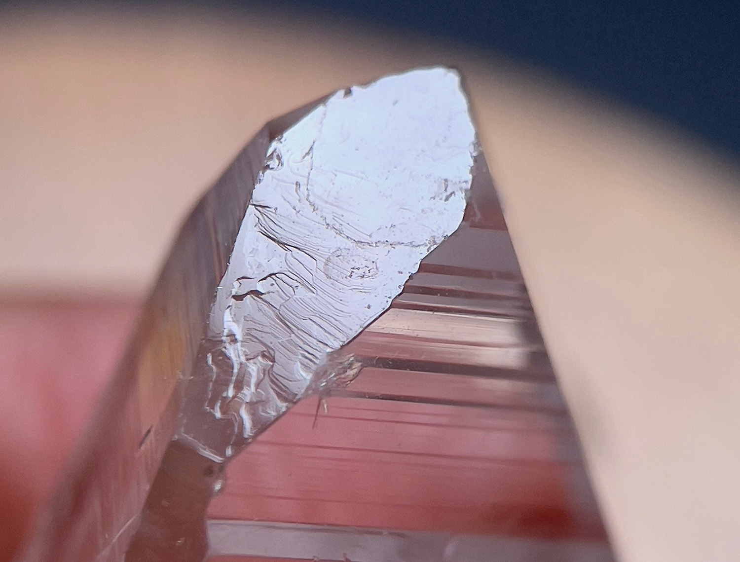 Peñas Blancas的列木里亞水晶的淨透感,有一種潤澤感,視覺上很像是穿透過極度純淨的水裡去看它,柱體的生長紋 (坊間稱的阿卡西線) 與Muzo區的類似,像是條碼一般,有很立體的,也有很細淡的,但有一個是比較像這個產地獨有的,就是一種水波紋感,我覺得也是因為這樣,所以有些看起來會像我前面說的,很像是穿透過極度純淨的水裡去看它。當然,不論是Muzo區或Peñas Blancas區的,都有不完全透亮,或是兩個產地看起來相似的,上述的淨透感與生長紋差異,只是針對常見的情況去描述,所以仍會有例外的。