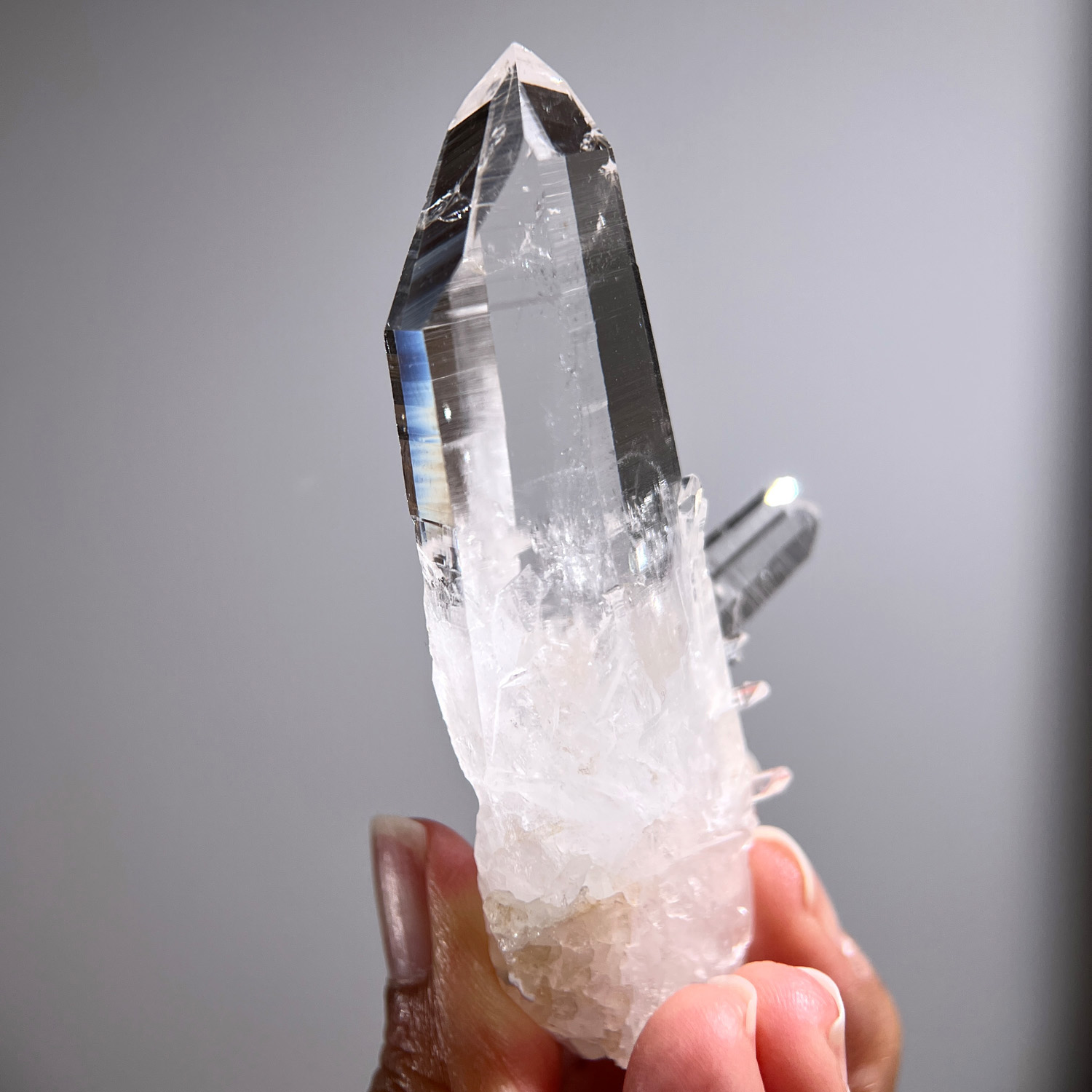 晶體非常亮透,柱體一側到底部有豐富的小晶體共生,其中有兩支共生最為突出,亦具有觸發的能力;另外,具有7-3-7的傳訊大師面向,某些稜面上有三角形資料庫記號,想更了解資料庫與大師水晶的特質,歡迎到大師水晶的介紹頁,點選相關文章觀看詳細介紹:大師水晶。