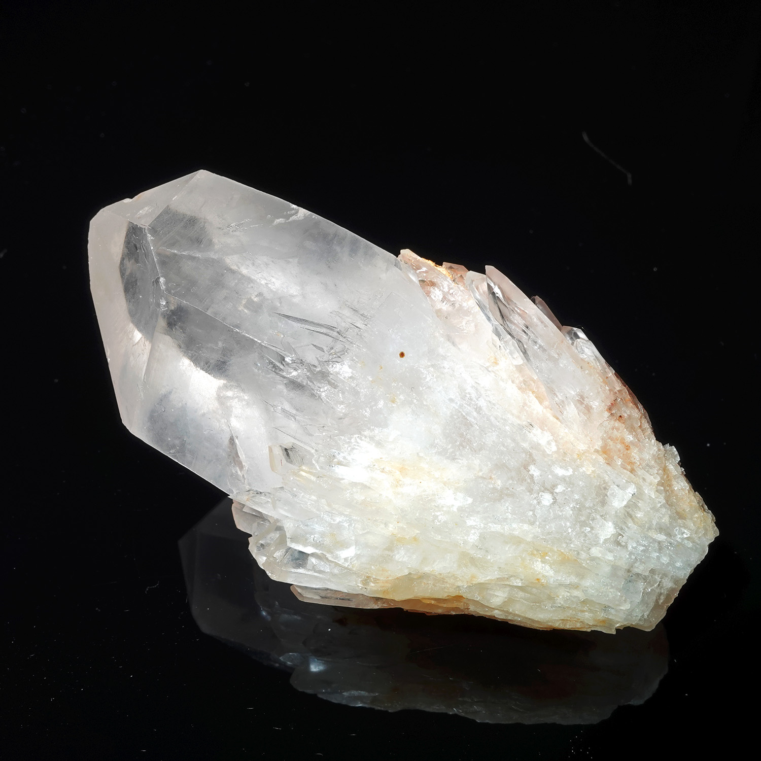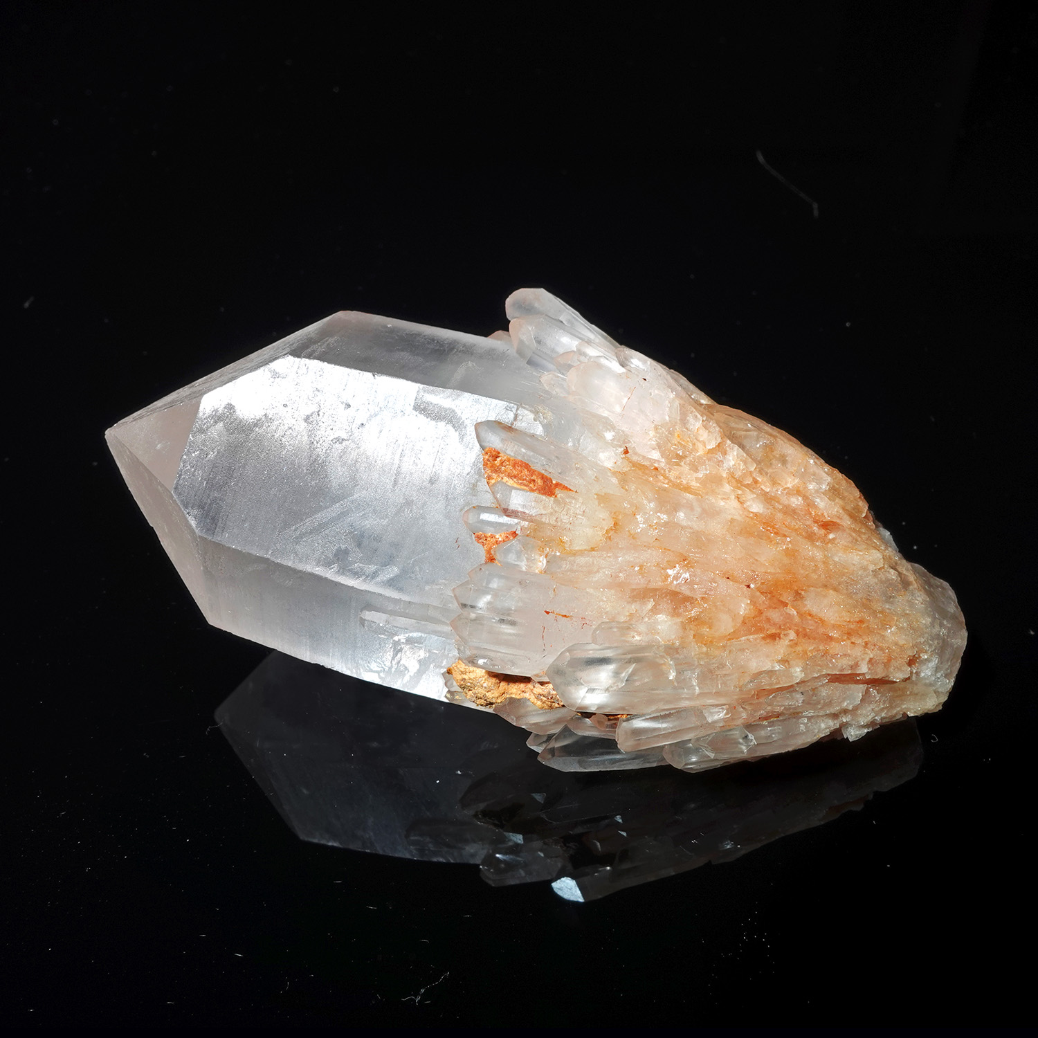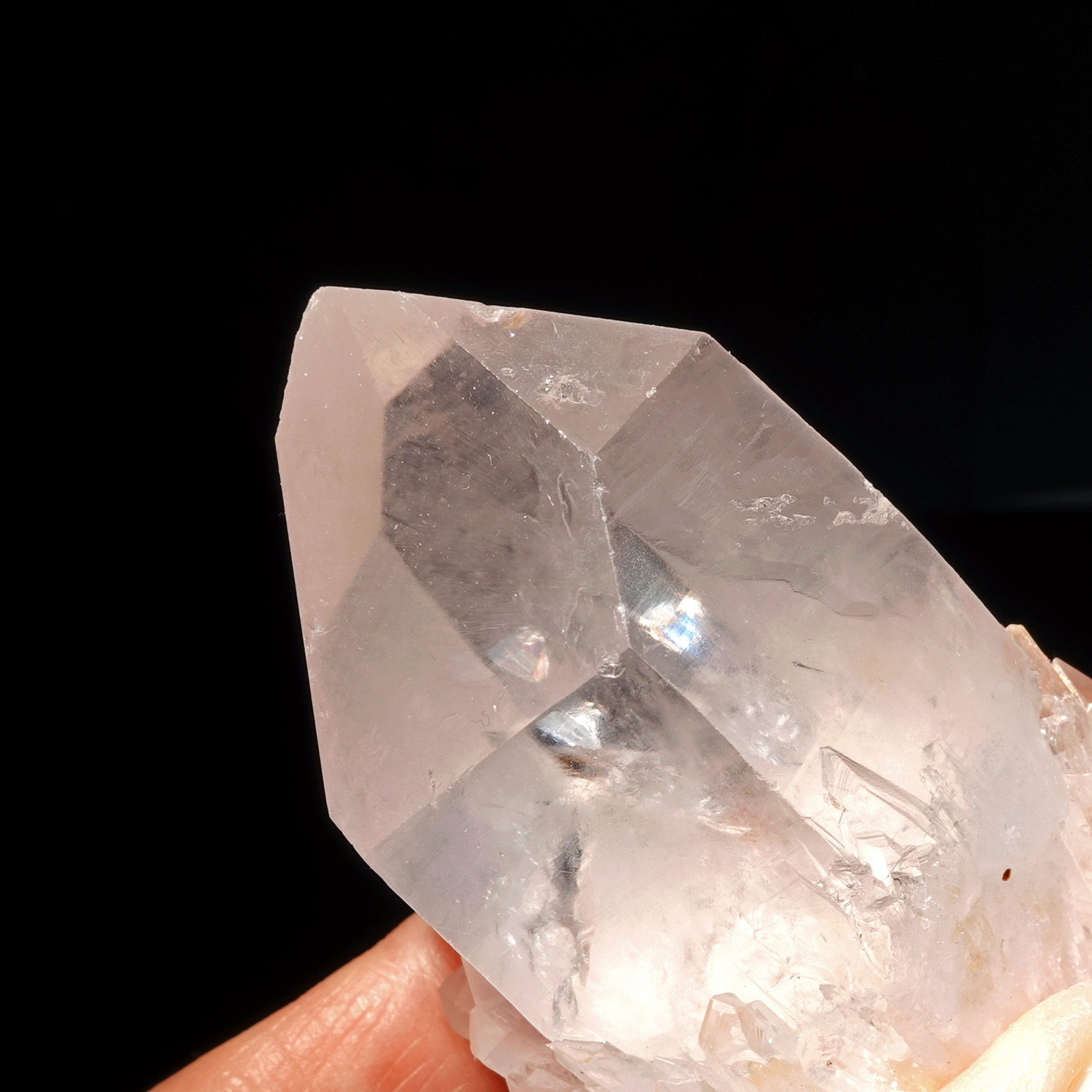 這支大師的周圍簇擁了非常多的共生小晶體,內部中央具有霧霜和鏡面,如果你看著內部,閉上眼睛,這些霧霜和鏡面會立刻顯現在你的內在視覺,那你就可以更直接的與這支水晶連結上;它的頻率非常共振上面的脈輪,擅長處理光的資訊,整體是相當動態的,讓資訊快速流入流出,能帶給我們宇宙的智慧,當然這也是內在的智慧,是光的解碼,光的知識。