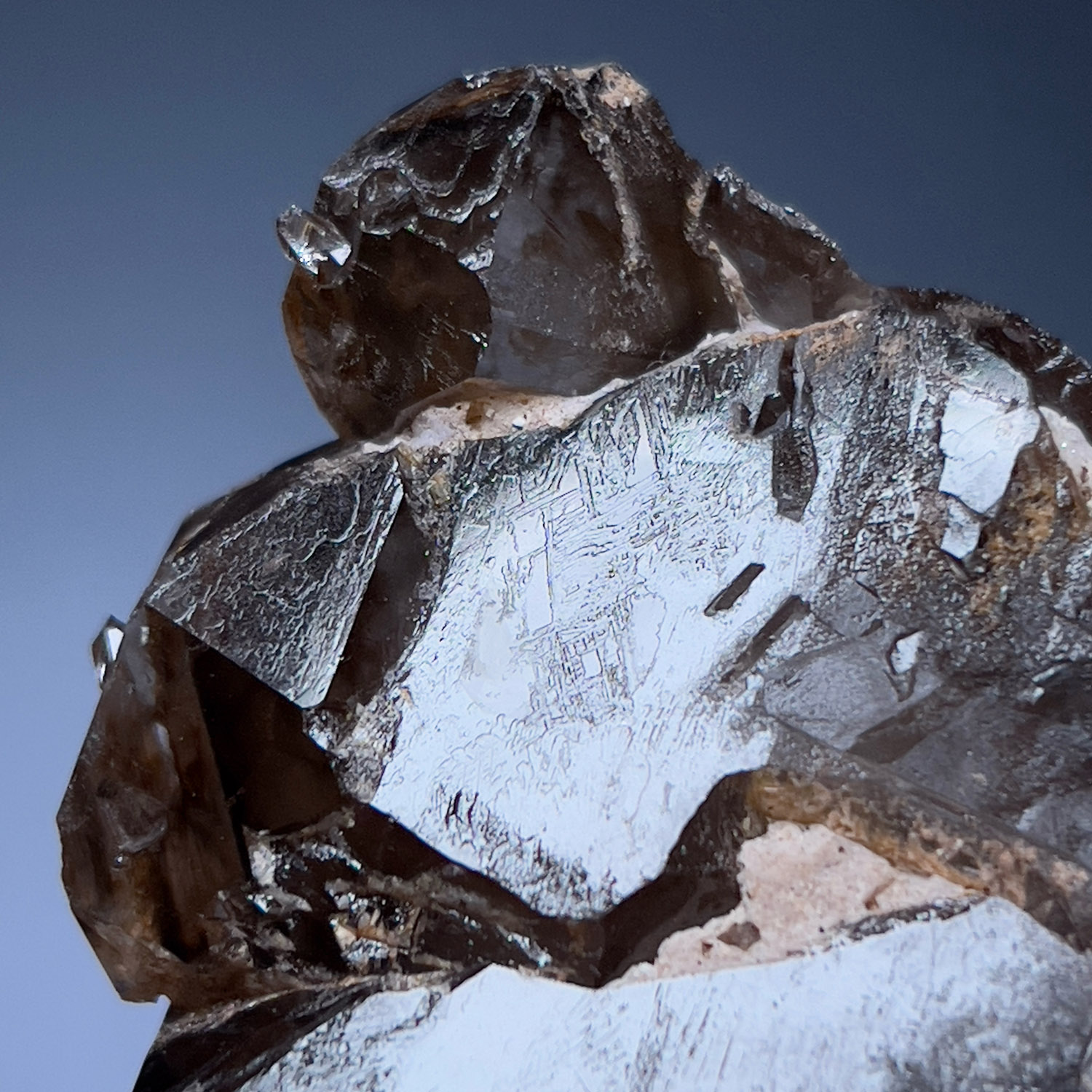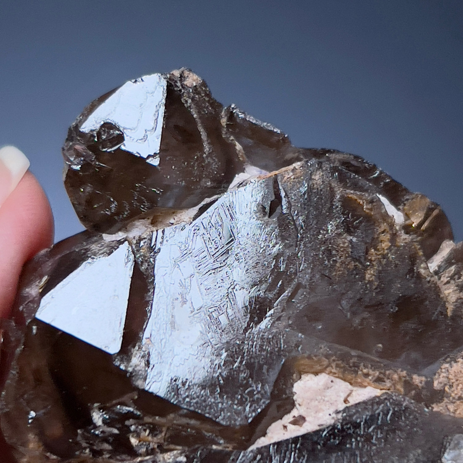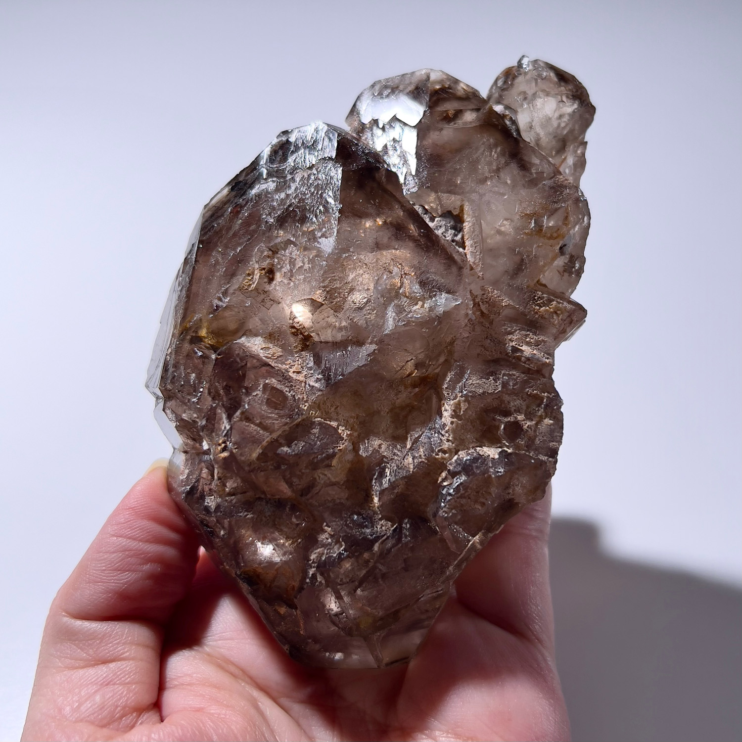 正面的型態是層層疊疊相當經典的鱷魚骨幹,其餘部分是天然生長的紋理,型態完整,是非常深邃更少見的深煙色,雖然表體有一點天然泥石共生,但晶體的表面與內部都相當的透亮,在不同光線下,有不同層次的煙燻感,正面骨幹的平面有非常多元的刻蝕痕和紋路,有一個部分像是一種圖騰印記 (如第三張第四張圖片),經連結有點像資料庫的概念,就像加密儲存資料一般,還有其他地方也有非常有趣的圖案感,通常都可以增益連結,並且感覺有非常多資訊在其中,可以自己打燈仔細看看。