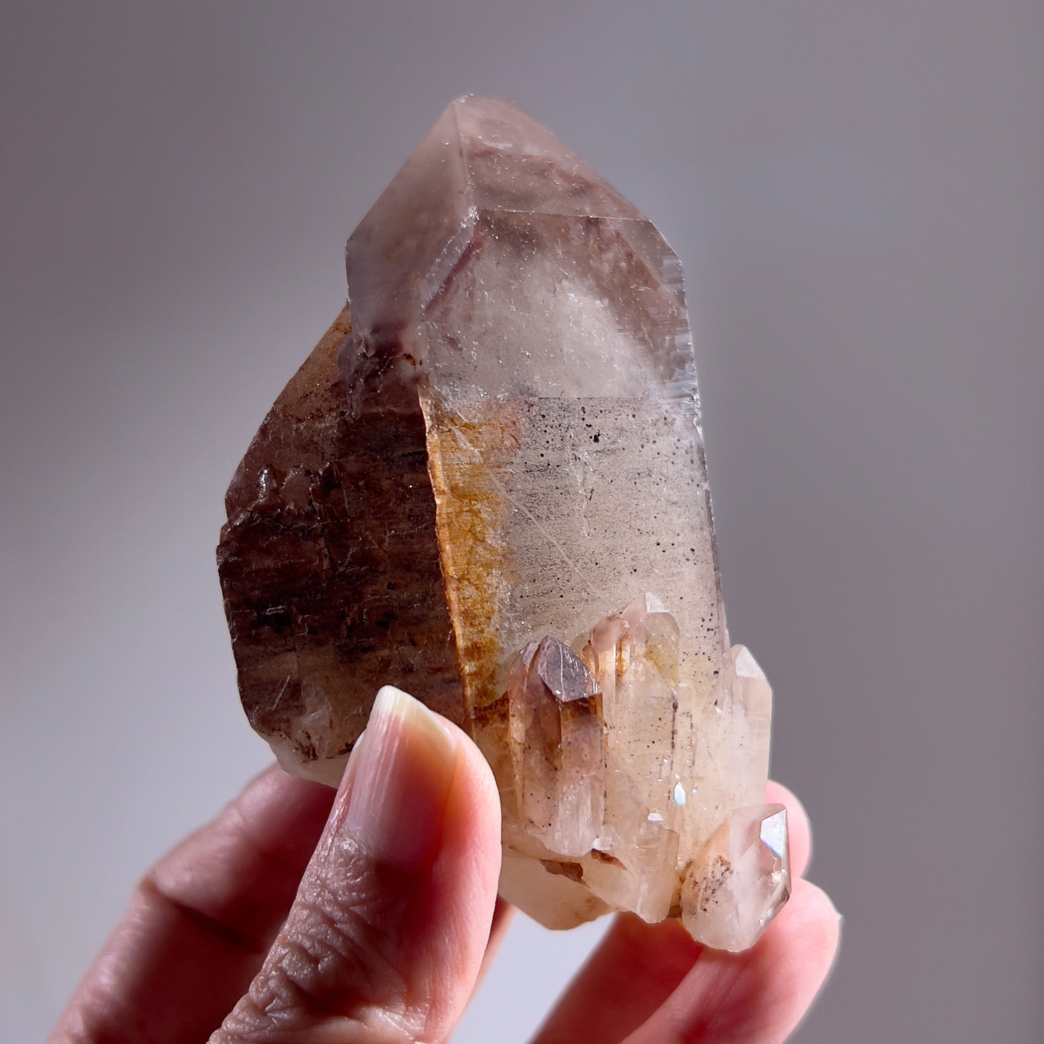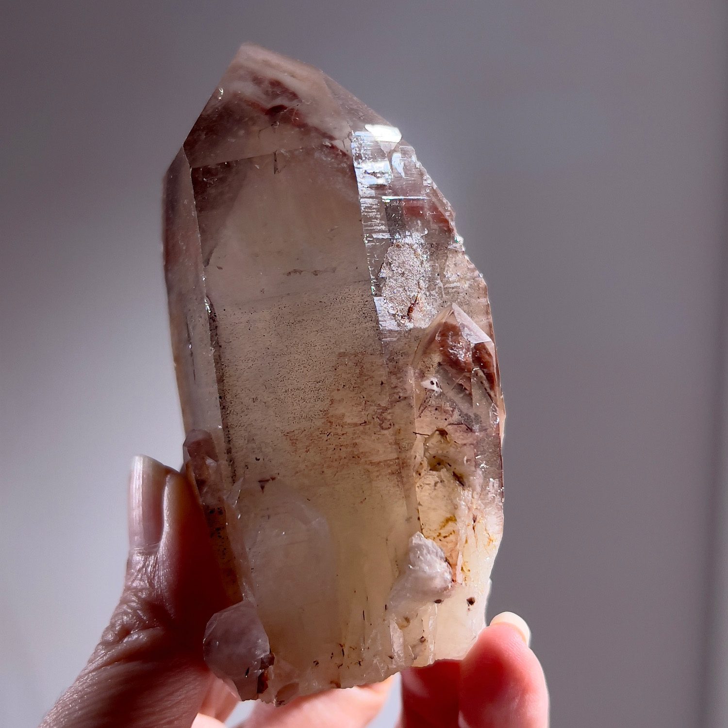 PS. 在南非橘河早期這種帶著紅色幻影的水晶非常知名,這支水晶側邊共生的小水晶也都有著紅色的幻影。