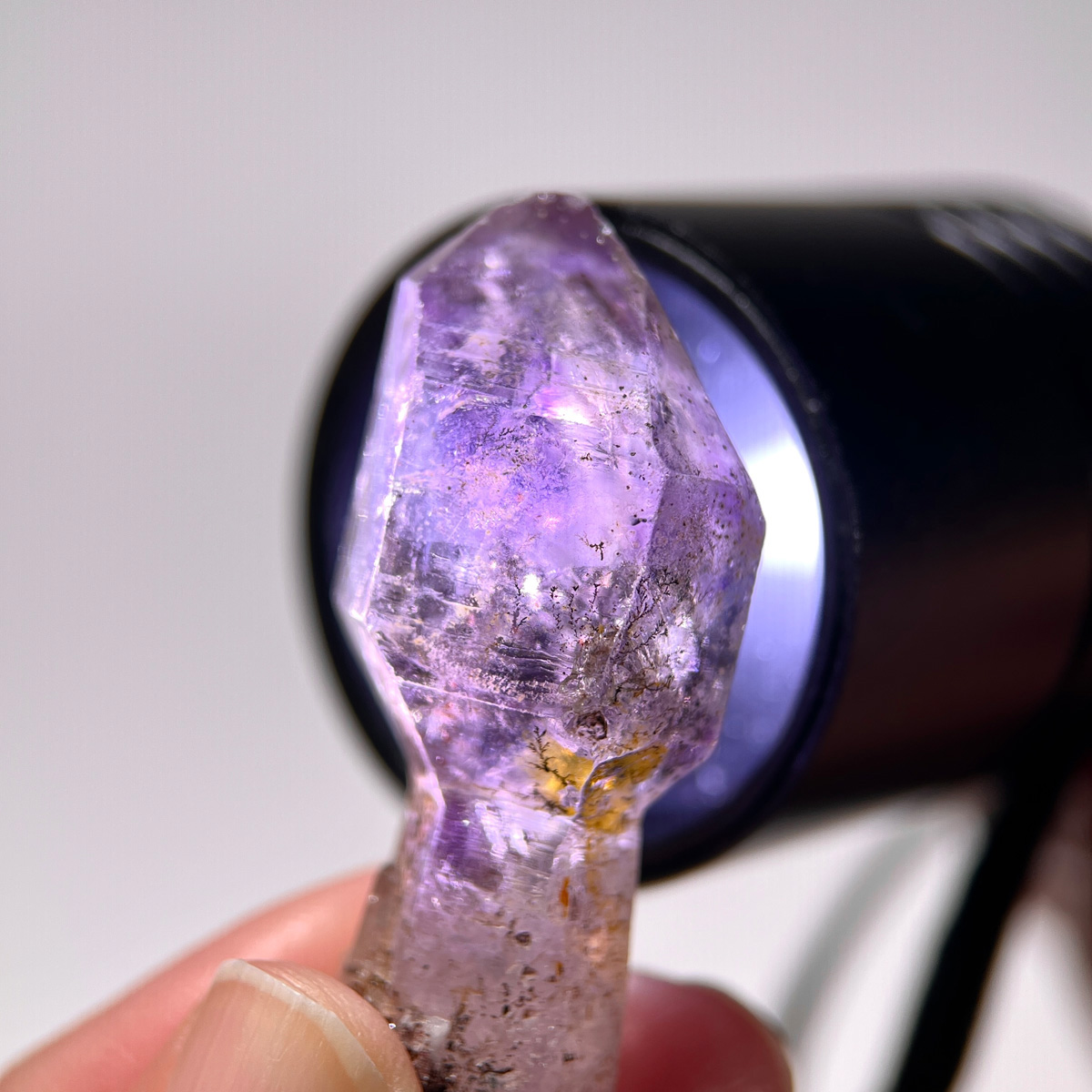 在使用手電筒或光源照射內部,可以看見散射出來的紫色光芒和清晰的內包裹,我建議你一邊轉動它們,一邊看著它們,因為那些散射出來的光芒具有很直接的能量和療癒性,也刺激了眼區的感受。